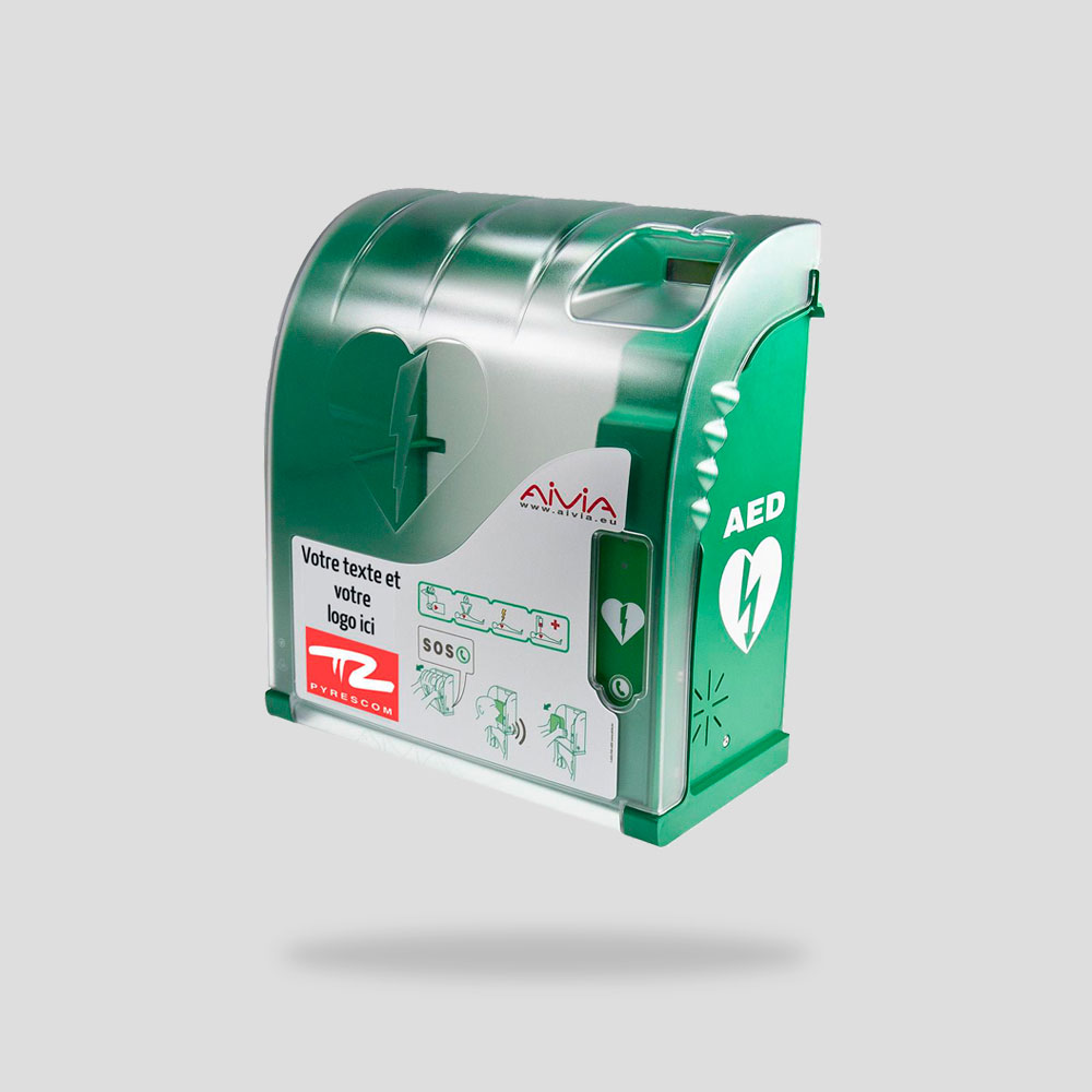 Nuevo Armario para desfibriladores AIVIA 100, fabricado en policarbonato y soporte en ABS.Gran resistencia a impactos, Alarma sonora (90 DB) y alarma visual con LED de color rojo que avisa de la apertura y acceso al equipo desfibrilador.