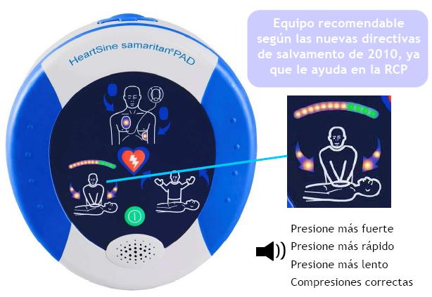 El Samaritan PAD 500P es a día de hoy el desfibrilador más avanzado del mercado, el único capaz de realizar una ayuda inteligente a la RCP, y por tanto aumentar las opciones de supervivencia de la persona, sin necesidad de electrodos especiales (y caros) que miden la presión realizada y que no funcionan correctamente con todas las personas. El 500P hace una medida directa en el pecho, y por tanto mucho más precisa, mediante la tecnología patentada ICG. No renuncie al mejor equipo, especialmente recomendado para personas no especialistas, que le indicará claramente si debe presionar con más fuerza o mayor o menor velocidad mediante indicaciones luminosas y sonoras. Y por supuesto con todas las otras ventajas del Samaritan 350P.